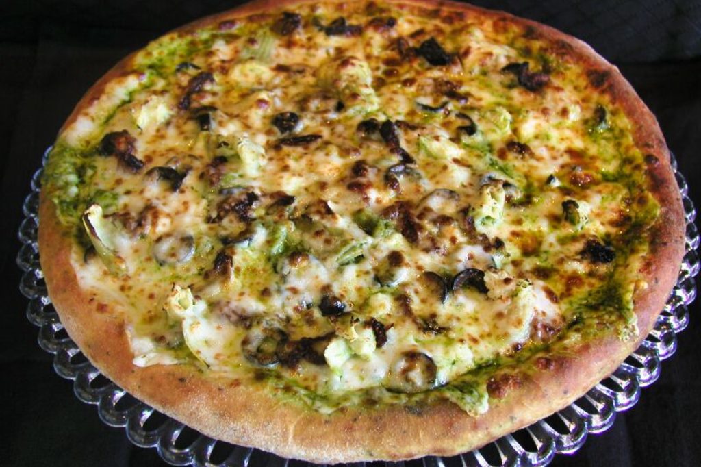Pesto sauce, artichoke hearts, garlic, sun-dried tomatoes, feta cheese & black olives.
